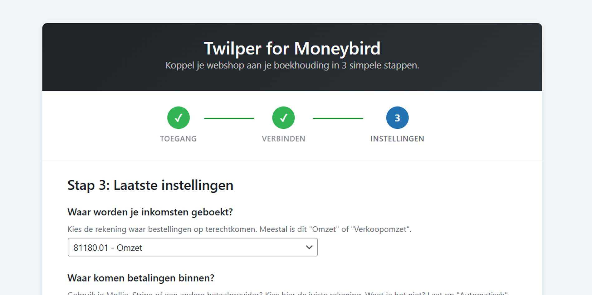 Alle configuratie-opties in één duidelijk overzicht. Grootboekrekening, sync instellingen en geavanceerde opties.
